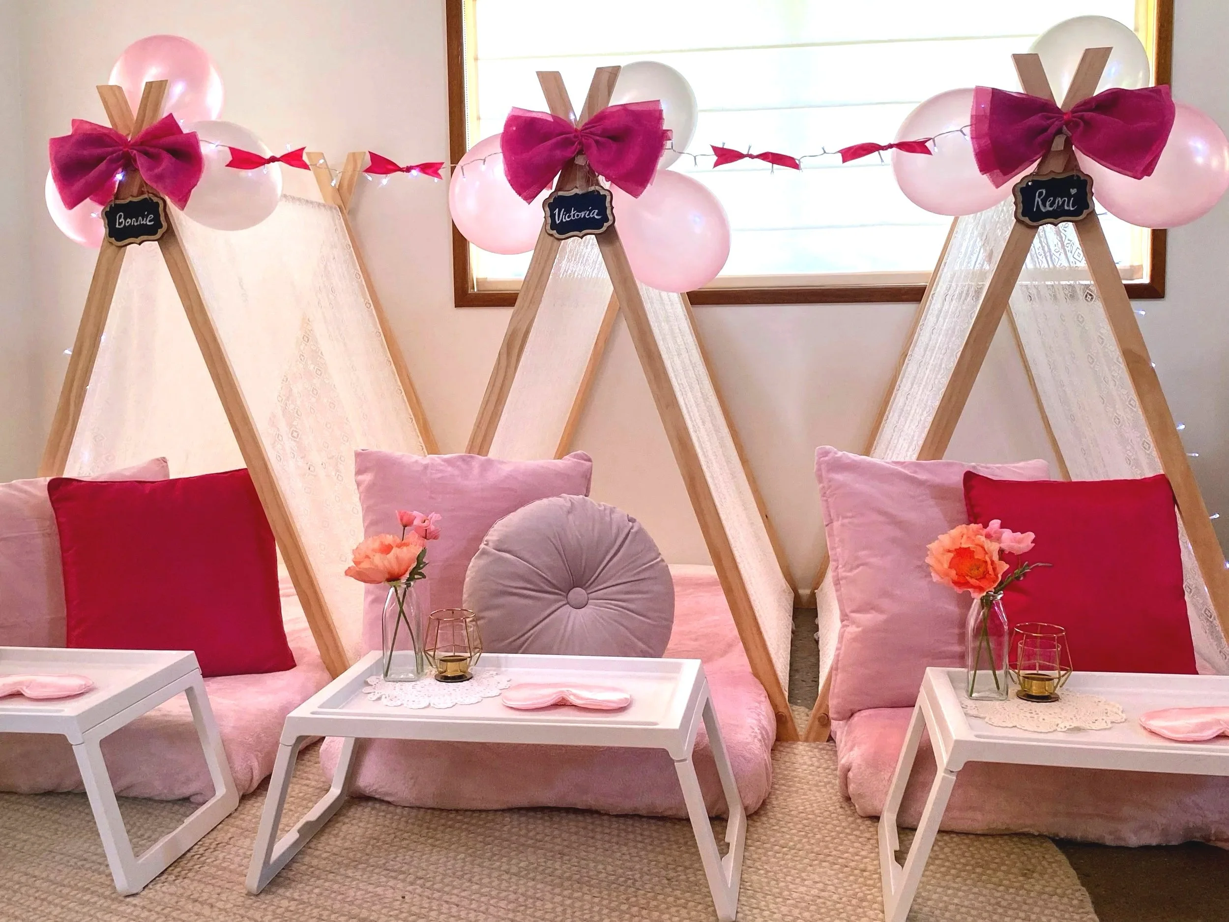 $250 covers set up and pack down of a beautifully themed sleepover setup with four teepees.